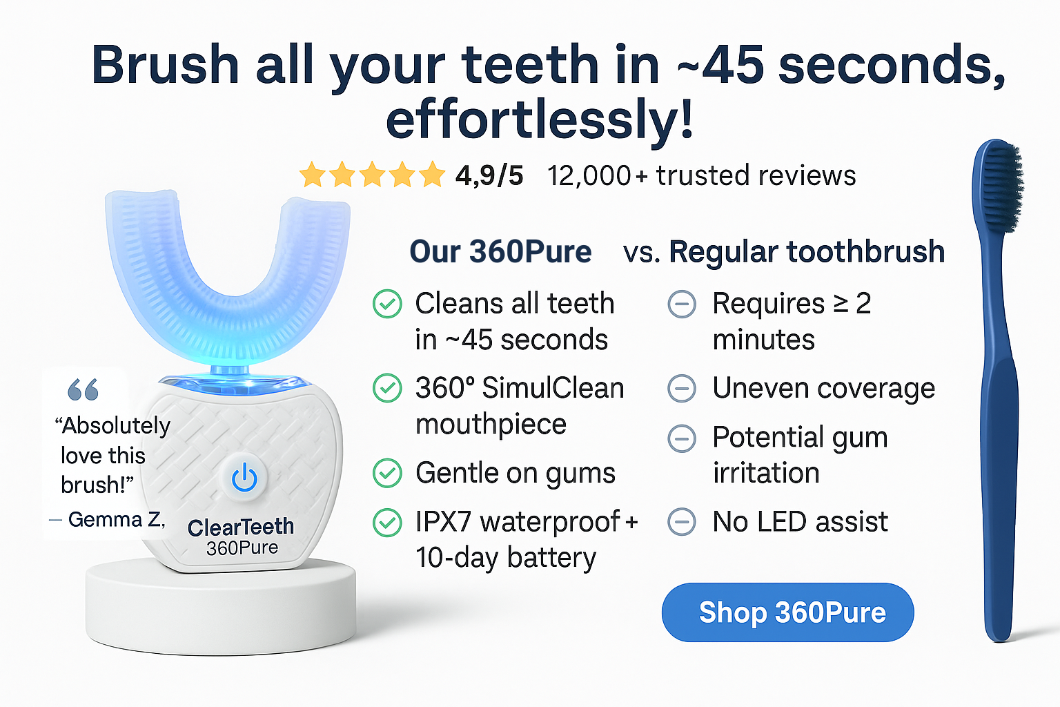 Introducing 360Pure® – The Revolutionary Hands-Free Toothbrush That Delivers a Complete, Professional-Grade Clean in Just 45 Seconds.